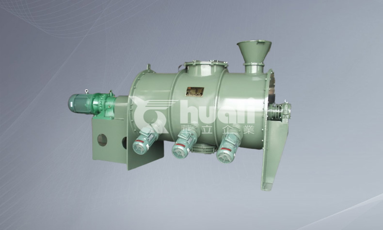 混合機(jī)開動(dòng)后犁刀繞軸旋轉(zhuǎn),帶動(dòng)物料沿筒體徑向作周向湍動(dòng),同時(shí)把物料沿犁刀兩側(cè)面的法線方向拋出。當(dāng)被拋出和作周向湍動(dòng)的物料流經(jīng)飛刀組時(shí),被高速旋轉(zhuǎn)的飛刀迅速、有力地拋散。物料在上述犁刀和飛刀的復(fù)合作用下,不斷更換、擴(kuò)散、在較短時(shí)間內(nèi)達(dá)到均勻混合,混合精度較高。對(duì)需要固-液混合的物料,混合液體通過噴液裝置均勻噴灑在筒體內(nèi)運(yùn)動(dòng)的物料上。